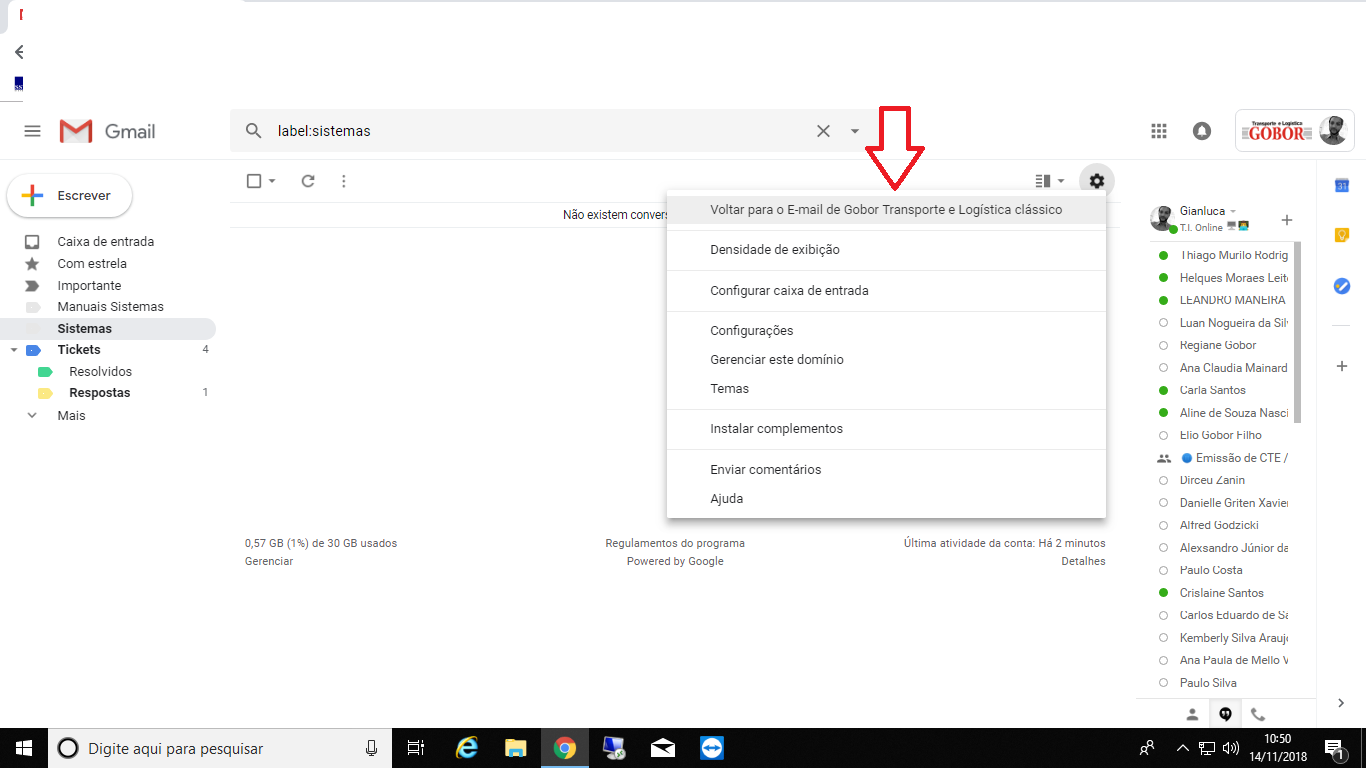 Passo 2 - Selecionar a opção "Voltar para o e-mail de Gobor transporte e logística classico".